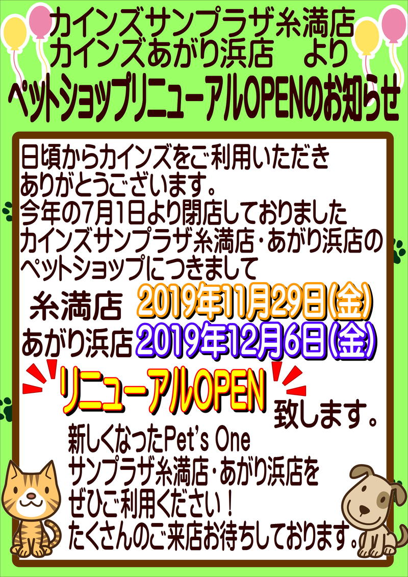 カインズサンプラザ糸満店・あがり浜店ペットショップリニューアルOPENのお知らせ